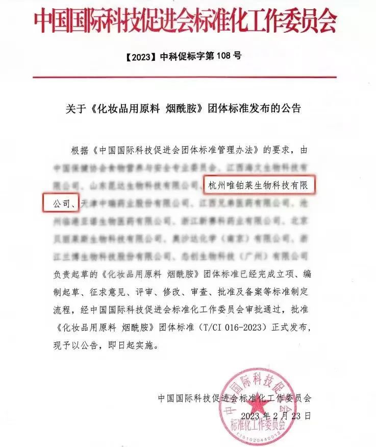 中国国际科技促进会标准化工作委员会发布了化妆品用原料烟酰胺团体标准,杭州唯铂莱生物科技有限公司作为起草单位参与编制。该团体标准发布是唯铂莱在深入推动创新驱动发展和标准化战略的一项重要成果。
