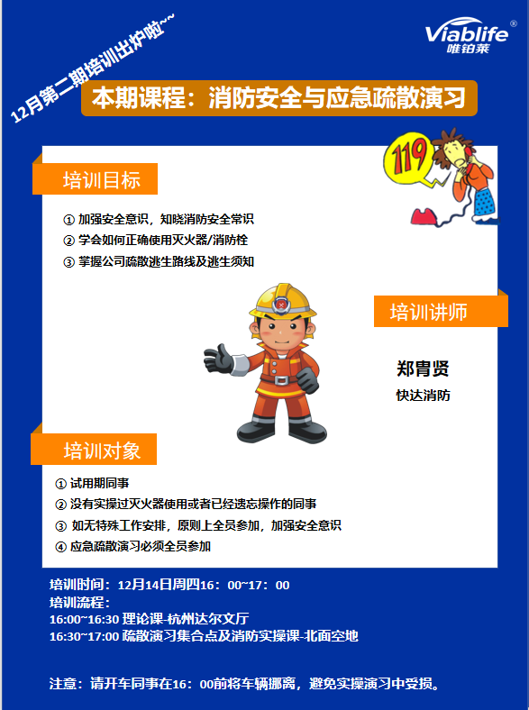 为提高唯铂莱员工的消防意识,知晓消防基本常识,学会如何使用灭火器,掌握公司的消防通道及安全撤离路线,12月14日下午16点,唯铂莱进行了本月的第二期培训——消防安全与应急疏散演习。