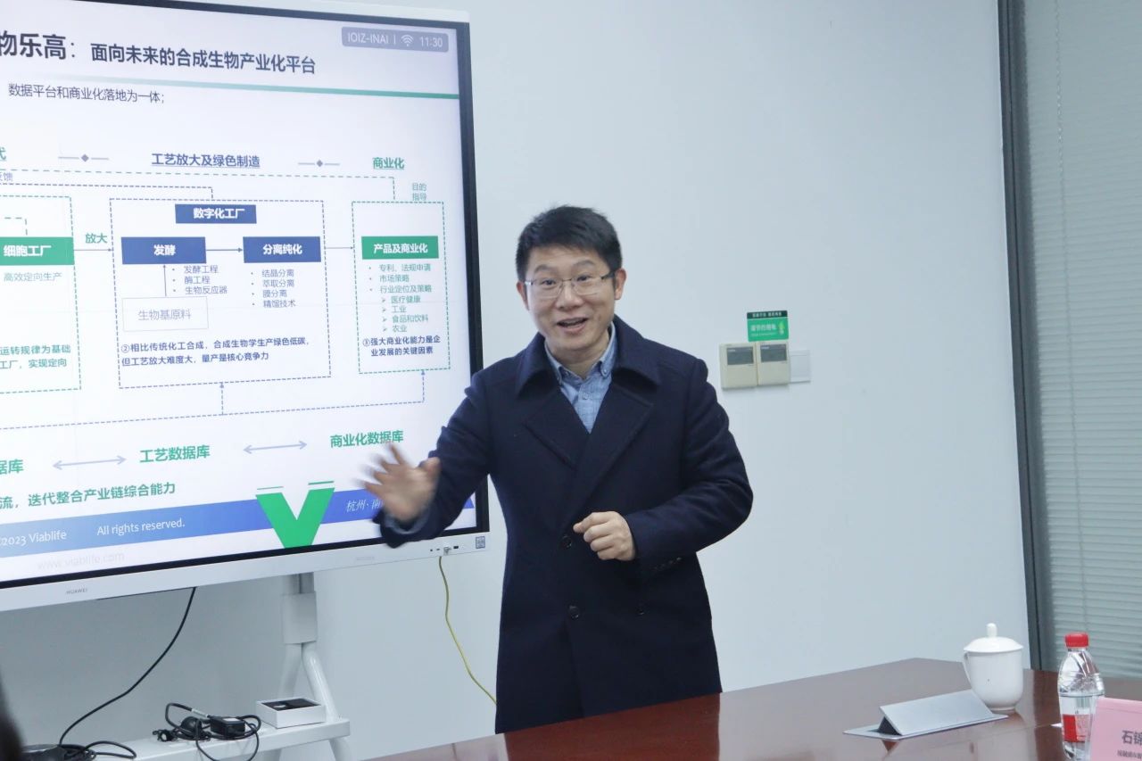 在我司陶福平总经理、公司副总于教授、副总秦博士的陪同下,参观唯铂莱展厅及价值创新平台骐骥平台和研发平台鸿鹄实验室。陶福平总经理详细介绍了公司的产业概况、技术优势、经营情况以及未来战略规划等。作为国内合成生物产业最早的一批企业,杭州唯铂莱始终坚持可持续发展,以绿色生物智造为导向,致力于成为绿色生物智造全球领导者。