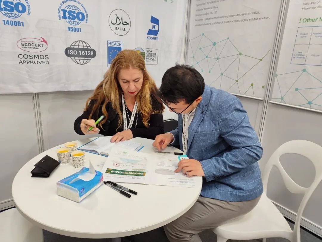 此次展会,唯铂莱携带日化原料最新产品神经酰胺NP和广受好评的新一代烟酰胺、羟基酪醇、咖啡酸等产品出席,向客户介绍公司的最新原料信息及研发成果。此外,唯铂莱也呈现了以神经酰胺NP为主要原料的舒敏修复体验装以及以新一代烟酰胺为主要原料的提亮保湿体验装,多维度展现唯铂莱高质量产品。