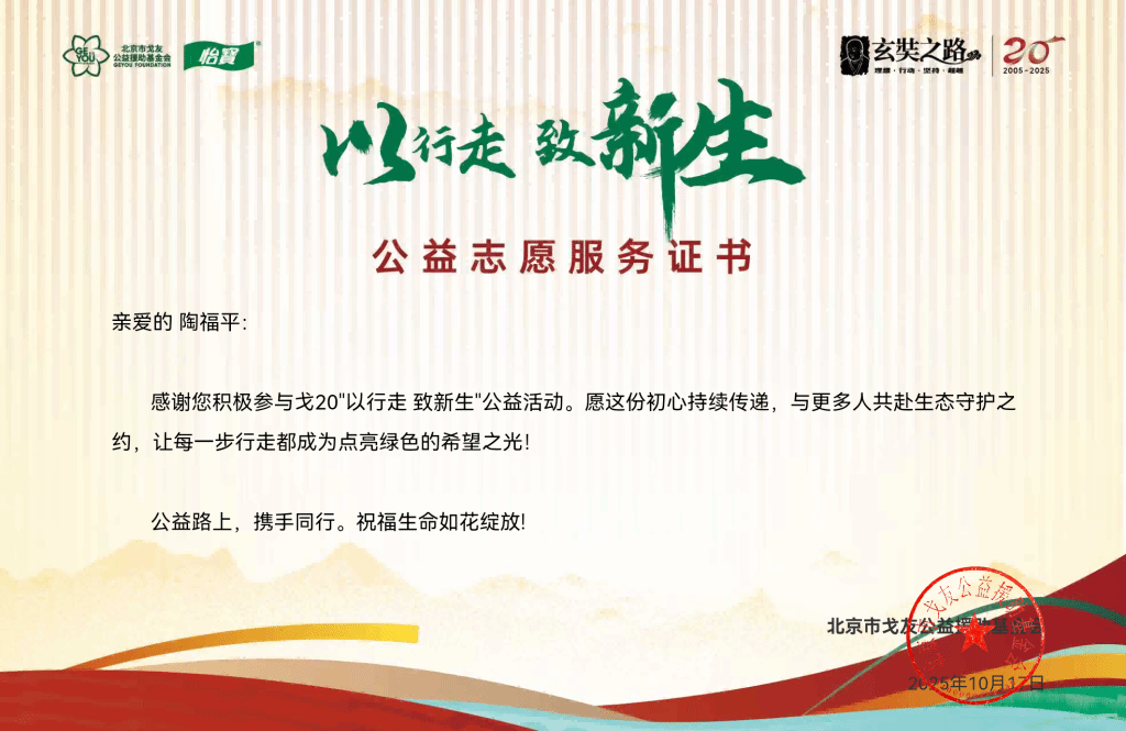 “用行走唤醒绿色,用热爱传递新生”陶福平先生以脚步丈量责任,以行动传递温情,让社会责任与民生情怀在公益实践中绽放光彩。