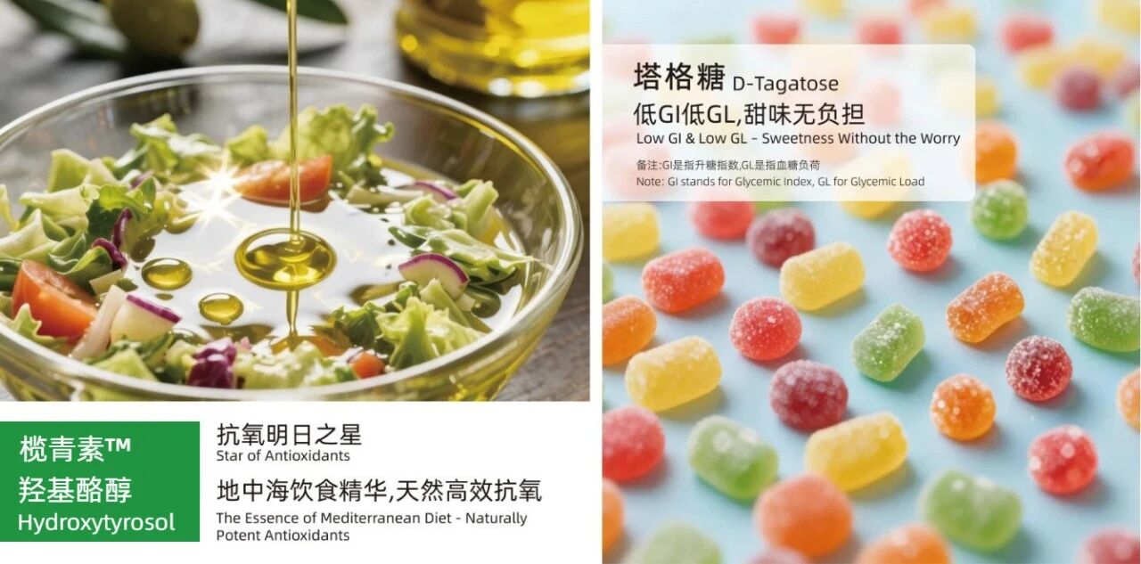 • 榄青素™羟基酪醇:凭借卓越的抗氧化与抗炎效能,精准贴合天然抗氧化剂的市场标签趋势,成为健康食品配料的优质之选;