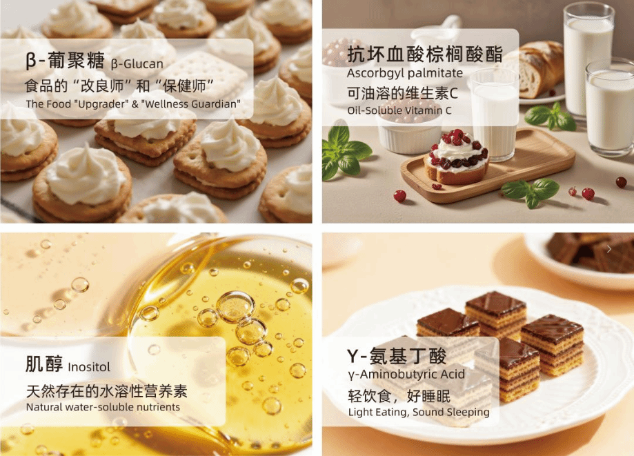 • β-葡聚糖 & 肌醇:持续拓展免疫支持与营养强化的应用边界,为乳制品、保健品、代餐等品类提供多元化营养赋能;